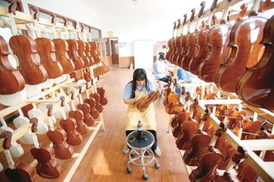 2000年左右,東高村鎮(zhèn)借助提琴產業(yè)和人力資源優(yōu)勢,將初期的小作坊模式逐步發(fā)展為集群樂器企業(yè)模式,把提琴產業(yè)這把“火”燒得越來越旺。到2008年,世界上每10把小提琴,便有3把來自這個小鎮(zhèn)。每年生產的近30萬把提琴,通過集裝箱,漂洋過海,銷往全球40多個國家和地區(qū)。