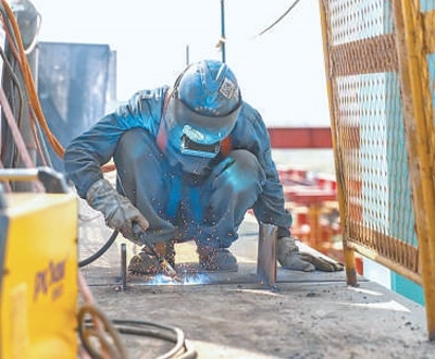 工人在橋面進行焊接作業(yè)。
