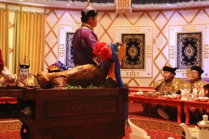 全羊宴是呼倫貝爾地區(qū)款待貴賓和祭奠及盛大節(jié)日宴會(huì)上的名貴佳肴,全羊宴色、香、味、形俱佳,別有風(fēng)味。全羊宴一般選用二歲左右肥全羯羊,其食用儀式頗為隆重,廚師先將整只羊放入大木盤中,在羊脖子上系上紅綢帶,呈給賓客觀看。有些宴席進(jìn)行開羊儀式,還會(huì)伴有呼麥表演。