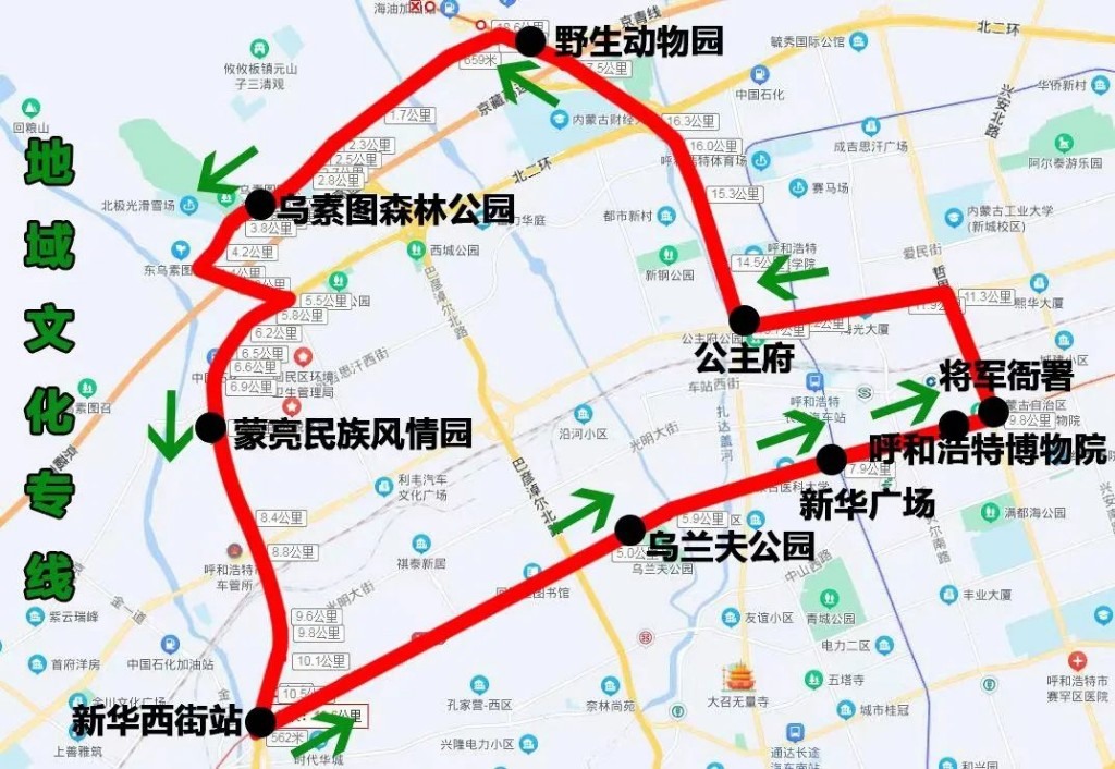 地域文化專線(新華西街站——蒙亮民族風(fēng)情園),途經(jīng):新華西街、新華大街、哲里木路、海拉爾大街、通道北路、生態(tài)路、鹽站西街、北二環(huán)輔道、西二環(huán)輔道。沿途設(shè)站:新華西街,烏蘭夫公園、新華廣場、呼和浩特博物院、將軍衙署、公主府、野生動物園、烏素圖森林公園、蒙亮民族風(fēng)情,全程:29公里,配車:10臺。