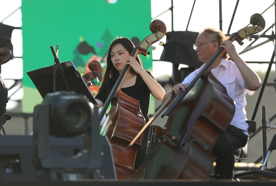 青山攬翠,林海歡歌。8月19日,內(nèi)蒙古烏蘭察布“森林之韻”蘇木山音樂季在蘇木山腳下的店子鎮(zhèn)盧家營村繼續(xù)上演??罩幸暯窍碌囊魳芳狙莩霈F(xiàn)場,燈光璀璨,人頭攢動(dòng)。樹樂隊(duì)、翅膀VS呼哈、劉文天、巫啟賢、陳雅森等演藝人員和北京藝鯤交響樂團(tuán),為游客帶來一場場視聽盛宴。