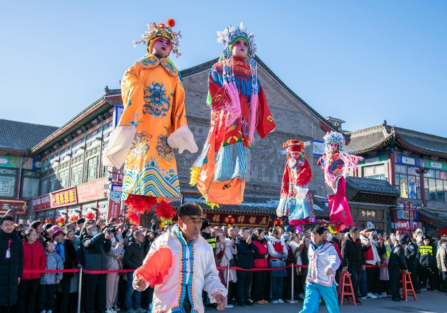 2024年2月15日,民間藝人在呼和浩特新春文化廟會(huì)現(xiàn)場(chǎng)進(jìn)行踩高蹺表演。丁根厚 攝