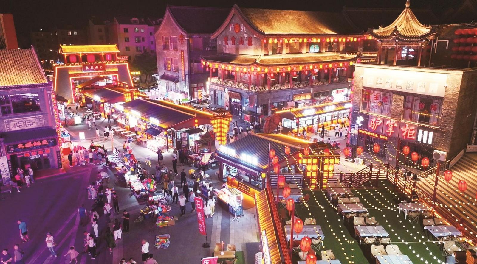 在這里,初秋是把煙火氣熬得更濃,晚風(fēng)卷著吆喝,把平凡日子燉成滾燙的歡喜,每一步都踩著熱鬧,每一眼都藏著舍不得溜走的夏天。飛檐翹角的建筑上,紅燈籠與黃串燈織就光網(wǎng)。穿漢服的人倚欄,晚風(fēng)裹著小吃香,把夏日余溫,釀成這古街獨(dú)有的浪漫。(祝家樂)