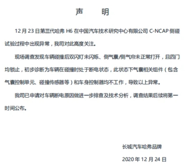 針對(duì)此碰撞結(jié)果,長(zhǎng)城汽車給出了官方聲明,稱初步診斷為車輛在碰撞時(shí)處于斷電狀態(tài),導(dǎo)致以上異常。具體內(nèi)容如下: