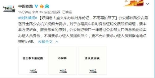 同時,公安部鐵路公安局還要求,對辦理乘車臨時身份證明相關公告、須知等再次進行排查,清理辦證需提供照片相關內容。