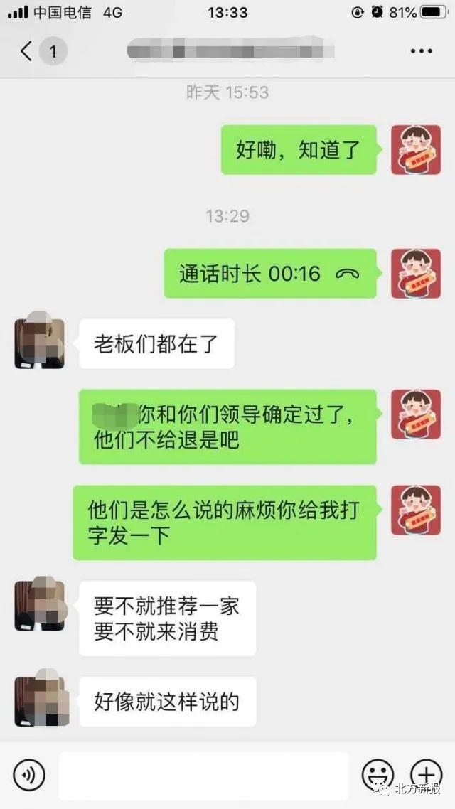 高先生提供給記者的一份微信聊天記錄顯示,當高先生提出退還押金的要求時,白泉山莊海世盛宴的工作人員告知,要不就推薦其他人到這里舉辦婚禮,要不就來這里消費以抵消押金??傊航鹗遣荒芡说?。