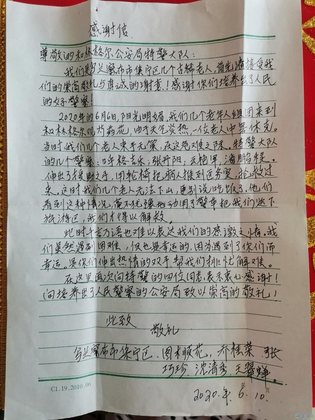 6月17日,呼和浩特市和林格爾縣公安局收到一個來自烏蘭察布市的快遞,收件人只寫著和林縣公安局,無具體部門與姓名。民警將其打開,里面竟是一面寫著“忠于職守、為民解憂”的錦旗、還有一封感謝信及一張合影照片。感謝信中寫道:此時千言萬語也難以表達我們的感激之情,我們雖然遇到困難,但也是幸運的,因為遇到了你們,是你們伸出熱情的雙手,幫我們排憂解難……