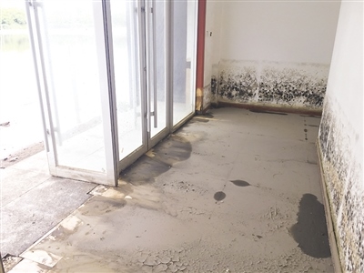 積水路面東側是已經(jīng)處于廢棄狀態(tài)的白廟子公安檢查站,檢查站內(nèi)外均殘留著被水泡過的痕跡。7月8日深夜,呼和浩特又降大雨。9日,記者再次來到緯五路看到,路面上的積水已經(jīng)蔓延到了檢查站樓內(nèi)。樓內(nèi)一片狼藉,從墻面上殘留的水印看,遭水淹最嚴重時樓內(nèi)積水深達五六十公分。