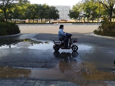 從張偉發(fā)來的視頻中可以清楚地看到,漏水點周圍淤積了大量黃泥,應該是地下自來水管漏水沖刷導致,新華西街市政府段南側非機動車道上有少量積水。