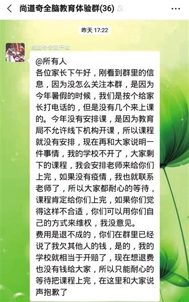 根據(jù)謝女士提供的轉(zhuǎn)賬證明和聊天截圖記者注意到,“尚道奇全腦教育體驗群”1月15日發(fā)布的一則通知稱,今年暑假,機構(gòu)老師曾挨個給家長打電話通知上課,但是沒有幾個來上課的,加上教育局不允許線下機構(gòu)開課,所以課程遲遲沒有安排。并稱學(xué)校賠錢了,沒有錢退給大家,只能耐心等待疫情結(jié)束后安排上課,如果家長覺得不合適,可以用自己的方式維權(quán)。“她的說辭明顯前后矛盾,暑假期間說課件損毀,現(xiàn)在又說沒學(xué)生上課?!敝x女士氣憤地說,和她遭遇同樣情況的還有30多名家長,399元雖然不是大數(shù)目,但這樣欺騙大家實屬不該。