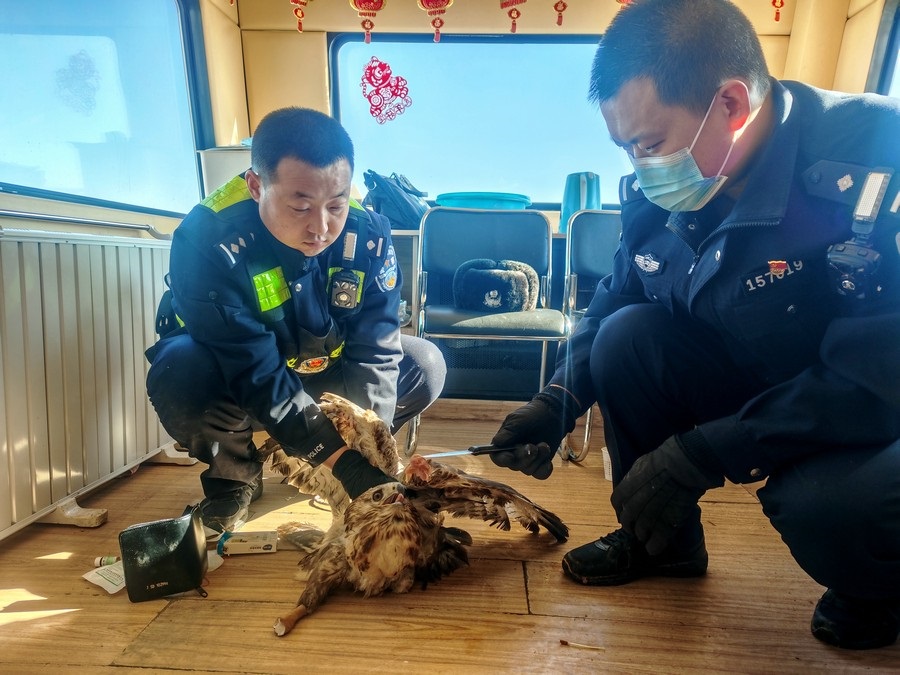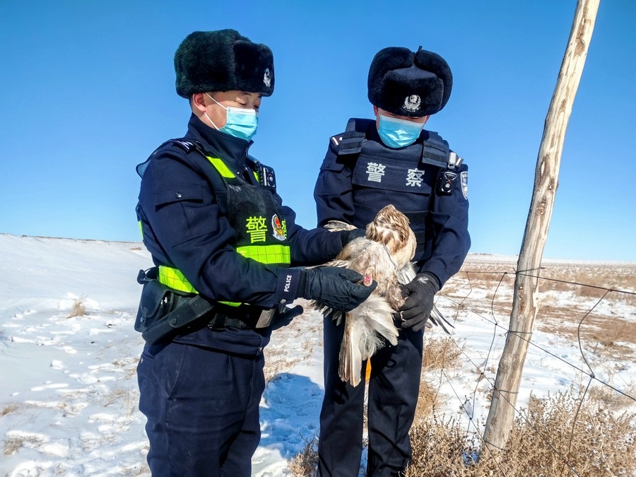 北疆新聞網(wǎng)、北疆新聞APP、北疆云消息(記者 劉嬙 通訊員 張路 張冬)2月10日,內(nèi)蒙古烏蘭察布市四子王旗腦木更邊境派出所民警在執(zhí)勤巡邏途中,發(fā)現(xiàn)一只“大鳥”被困在網(wǎng)圍欄上。民警靠近后仔細(xì)觀察發(fā)現(xiàn),這只“大鳥”在奮力撲打翅膀但無法飛行,右爪缺失,受傷嚴(yán)重。民警通過手機(jī)搜索網(wǎng)絡(luò)圖片比對,初步判定為國家二級保護(hù)動(dòng)物鷹隼。