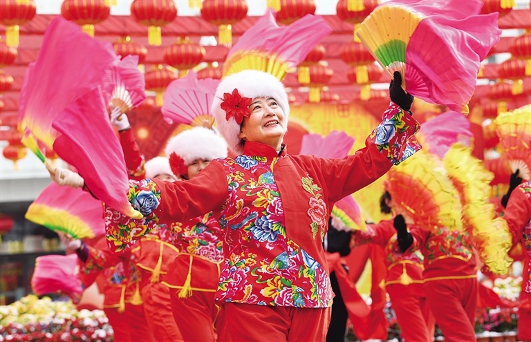 2月14日,演員們在內(nèi)蒙古展覽館廣場上跳起歡快的舞蹈。當(dāng)日,內(nèi)蒙古展覽館開展“傳統(tǒng)文化月月傳”邀您一起鬧元宵活動。記者 王磊 攝