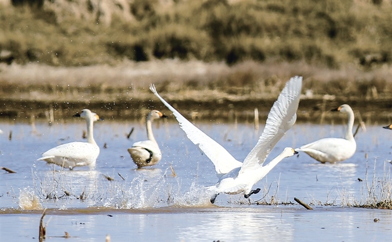 4月1日是國際愛鳥日。當(dāng)天下午,記者在呼和浩特市托克托縣伍什家鎮(zhèn)附近看到,正值春灌時節(jié),沿路兩側(cè)阡陌縱橫的田地里一片“汪洋”,棲息著成群結(jié)隊(duì)的天鵝,時而引吭高歌,時而梳理羽毛,時而追逐嬉戲。偌大的田地仿佛天鵝湖一般,呈現(xiàn)出靈動優(yōu)美的自然畫卷。