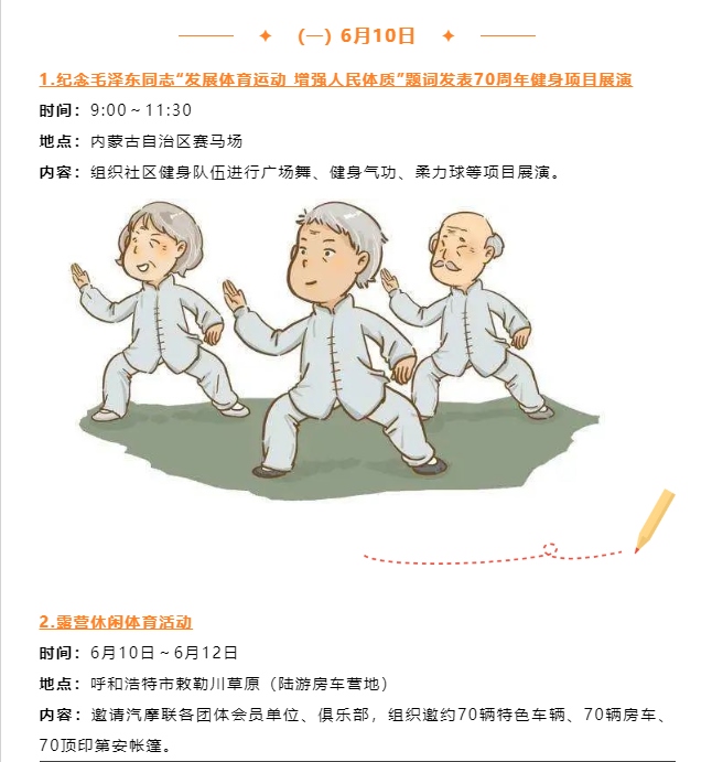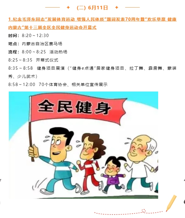 記者從自治區(qū)體育局獲悉,紀(jì)念毛澤東同志“發(fā)展體育運(yùn)動,增強(qiáng)人民體質(zhì)”題詞70周年暨“歡樂草原健康內(nèi)蒙古”第十三屆全區(qū)全民健身運(yùn)動會將于6月10日至11日歡樂開啟。