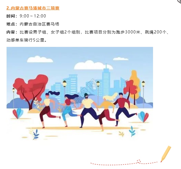 本次運(yùn)動會認(rèn)真踐行“以人民為中心”辦賽理念,創(chuàng)新探索聚集少、規(guī)模小、符合大眾運(yùn)動口味的內(nèi)蒙古賽馬場城市三項賽,包含跑步3000米、跳繩200個和動感單車騎行5公里3個項目比賽。此外,還將舉辦公園系列挑戰(zhàn)賽、“跑遍青城”系列路跑活動等,讓群眾在暢享運(yùn)動的過程中盡情領(lǐng)略城市綠景的清新曼妙,進(jìn)一步推動全民健身與全民健康深度融合。