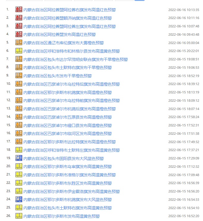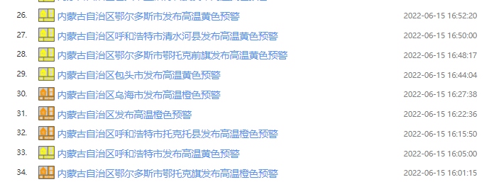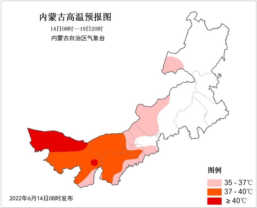 據(jù)內(nèi)蒙古氣象臺(tái)預(yù)計(jì),6月16~20日連續(xù)5天,內(nèi)蒙古西部及中部偏西大部地區(qū)(阿拉善盟、烏海市、巴彥淖爾市、鄂爾多斯市、包頭市、呼和浩特市等大部地區(qū))將迎來今年首次大范圍35℃以上高溫天氣,其中,西部部分地區(qū)最高氣溫將達(dá)37℃及以上,局地超過40℃;20~21日阿拉善盟高溫將逐漸減弱消失,而35℃以上高溫天氣向錫林郭勒盟西部延伸。