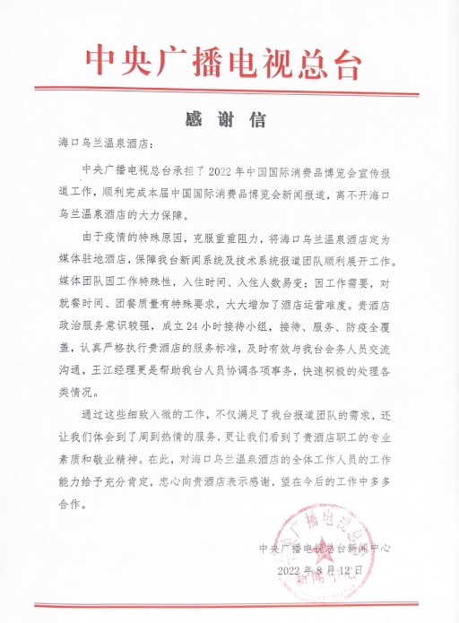 中央廣播電視總臺(tái)順利完成了在海南召開的2022年中國(guó)國(guó)際消費(fèi)品博覽會(huì)的新聞報(bào)道,離不開海口烏蘭溫泉酒店的大力保障。媒體團(tuán)隊(duì)因工作特殊性,入住時(shí)間、入住人數(shù)易變;對(duì)就餐時(shí)間、團(tuán)餐質(zhì)量有特殊要求,大大增加了酒店運(yùn)營(yíng)難度。貴酒店政治服務(wù)意識(shí)較強(qiáng),成立24小時(shí)接待小組,接待、服務(wù)、防疫全覆蓋,及時(shí)有效與我臺(tái)會(huì)務(wù)人員交流溝通,通過細(xì)致入微的工作,不僅滿足了我臺(tái)報(bào)道團(tuán)隊(duì)的需求,還讓我們體會(huì)到了周到熱情的服務(wù),更讓我們看到了貴酒店職工的專業(yè)素質(zhì)和敬業(yè)精神。在此,對(duì)??跒跆m溫泉酒店的全體工作人員的工作能力給予充分肯定,衷心向貴酒店表示感謝。