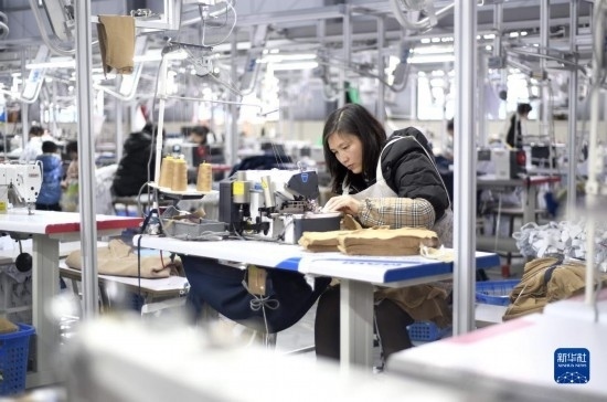 2月15日,工人在貴州省黔西南布依族苗族自治州安龍縣一家服裝企業(yè)生產(chǎn)車(chē)間加工服裝產(chǎn)品。