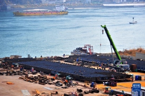 2月14日,湖北省宜昌市夷陵區(qū)樂(lè)天溪造船基地工人在加工制造大型貨船。
