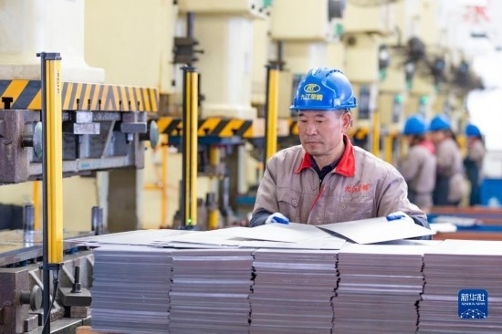 2月15日,在山東省濱州市博興縣店子鎮(zhèn)一家廚具生產(chǎn)企業(yè)車(chē)間內(nèi),工人在生產(chǎn)線上加工廚具。