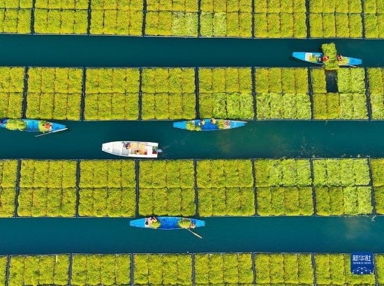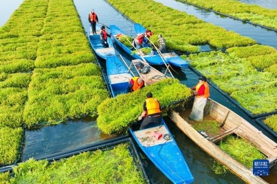 近年來(lái),浙江省杭州市淳安縣在千島湖典型庫(kù)灣、入湖口等區(qū)域,積極運(yùn)用生態(tài)浮島水上植物無(wú)土栽培技術(shù)種植空心菜、水芹菜等水生蔬菜,直接吸收庫(kù)區(qū)水體中氮磷等元素,從而能夠有效地降低水體中營(yíng)養(yǎng)物質(zhì)的含量,提升水質(zhì)。近日,水生蔬菜進(jìn)入采收季節(jié),“湖上菜園”呈現(xiàn)春收繁忙景象。