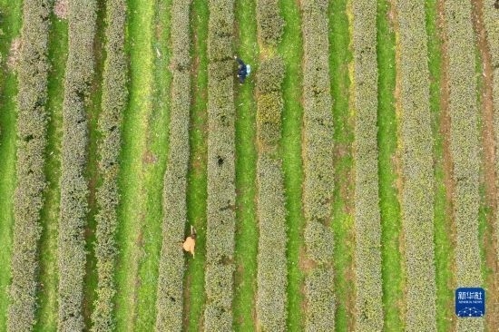 2月17日,茶農(nóng)在湖北省丹江口市土關(guān)埡村武當(dāng)茶谷勞作(無(wú)人機(jī)照片)。