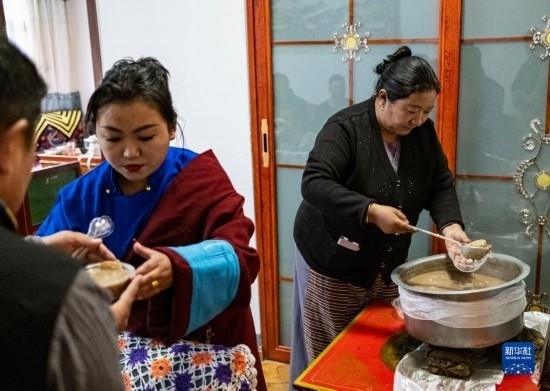 在位于森布日安置點的家中,石秀次仁的家人在盛“古突”(2月19日攝)。