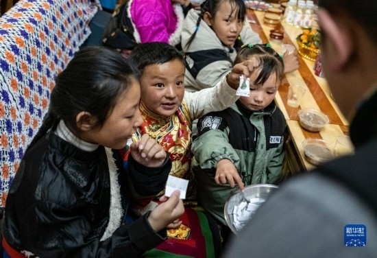 在位于森布日安置點的家中,石秀次仁家的孩子們在向家人展示自己隨機拿取的小紙條。畫在紙條上的圖案有著不同的寓意(2月19日攝)。