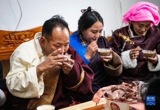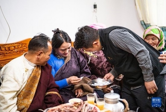 在位于森布日安置點的家中,石秀次仁(左)和家人一起吃“古突”(2月19日攝)。