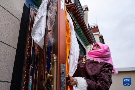 石秀次仁的家人往門上掛哈達,祝福新一年吉祥如意(2月19日攝)。