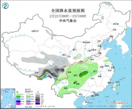 全國降水量預(yù)報圖(2月20日08時-21日08時)。圖片來源:中央氣象臺網(wǎng)站