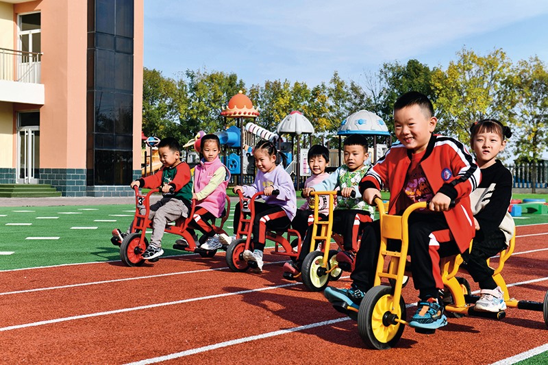 在山東省東營(yíng)市墾利區(qū)楊廟社區(qū)幼兒園,孩子們?cè)诶蠋煹膸ьI(lǐng)下進(jìn)行戶(hù)外活動(dòng)(2021年10月19日攝) 郭緒雷攝