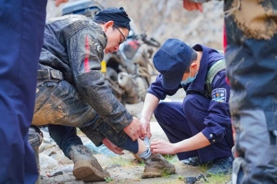 圖為庫(kù)地邊境檢查站移民管理警察查看遇險(xiǎn)群眾傷情。