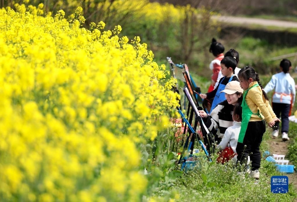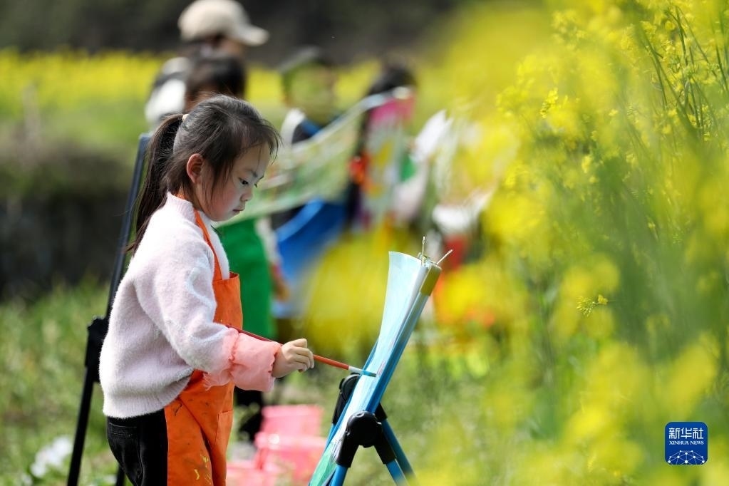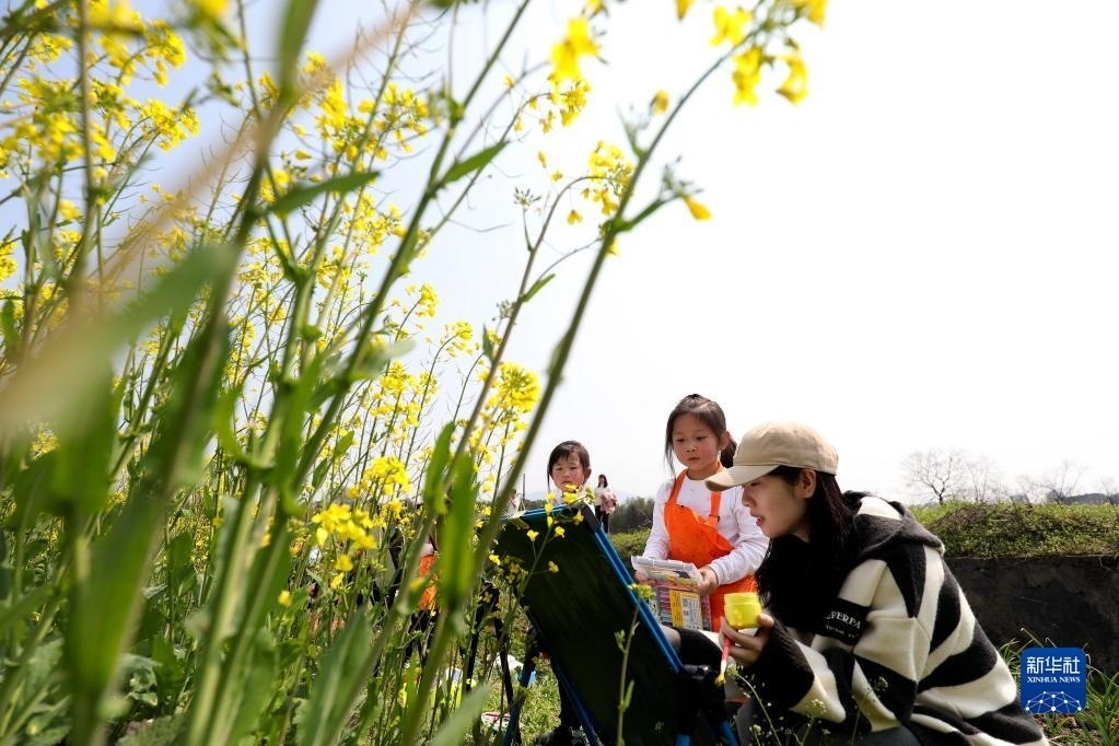 2月28日,在湖南省資興市唐洞街道高碼村,小朋友在油菜花田旁畫(huà)畫(huà)。