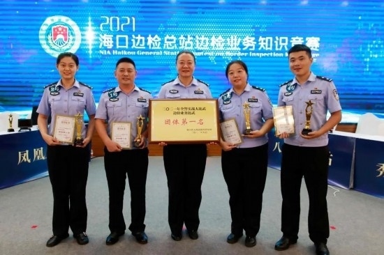 圖為2021年,王東玉(左一)和 同事參加全省邊檢業(yè)務(wù)崗位技能競賽比武。
