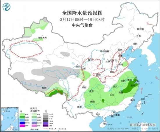 3月17日08時至18日08時,西藏中東部、青海南部等地部分地區(qū)有小雪或雨夾雪。西藏東南部、江淮大部、江漢東部、江南大部、西南地區(qū)東部、華南北部等地部分地區(qū)有小雨,部分地區(qū)有中雨。黑龍江東北部部分地區(qū)有4~5級風(fēng)。