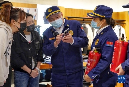 3月14日,消防支隊防火監(jiān)督員(中)為商場商戶講解如何使用手機(jī)掃碼方式辨別消防產(chǎn)品真?zhèn)巍?/p>