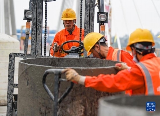 3月18日,在位于四川省瀘州市的渝昆高鐵瀘州沱江特大橋主跨合龍施工現(xiàn)場(chǎng),施工人員在安裝混凝土運(yùn)輸管道。