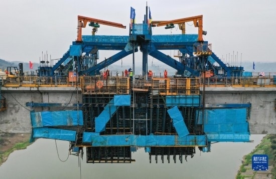 3月18日在位于四川省瀘州市拍攝的渝昆高鐵瀘州沱江特大橋主跨合龍施工現(xiàn)場(chǎng)(無(wú)人機(jī)照片)。