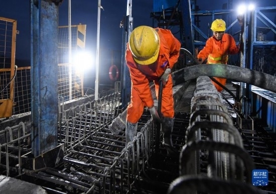 3月18日,在位于四川省瀘州市的渝昆高鐵瀘州沱江特大橋主跨合龍現(xiàn)場(chǎng),施工人員在進(jìn)行混凝土澆筑。