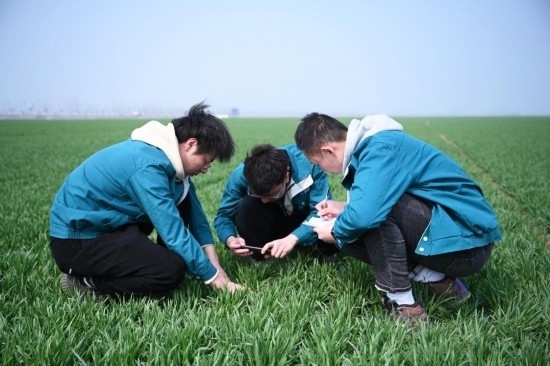 2月28日,在西平縣老王坡高標(biāo)準(zhǔn)農(nóng)田示范區(qū),臺(tái)曉林(左)、王仲琦和王英凡(右)一起觀察苗情草情并記錄。