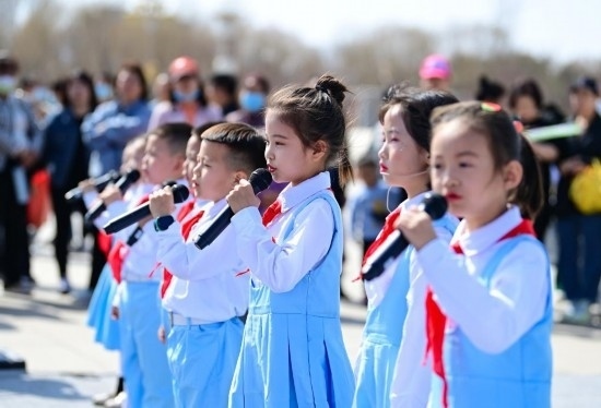 4月1日,小朋友在康巴什區(qū)亞洲雕塑藝術(shù)主題公園朗誦詩歌。