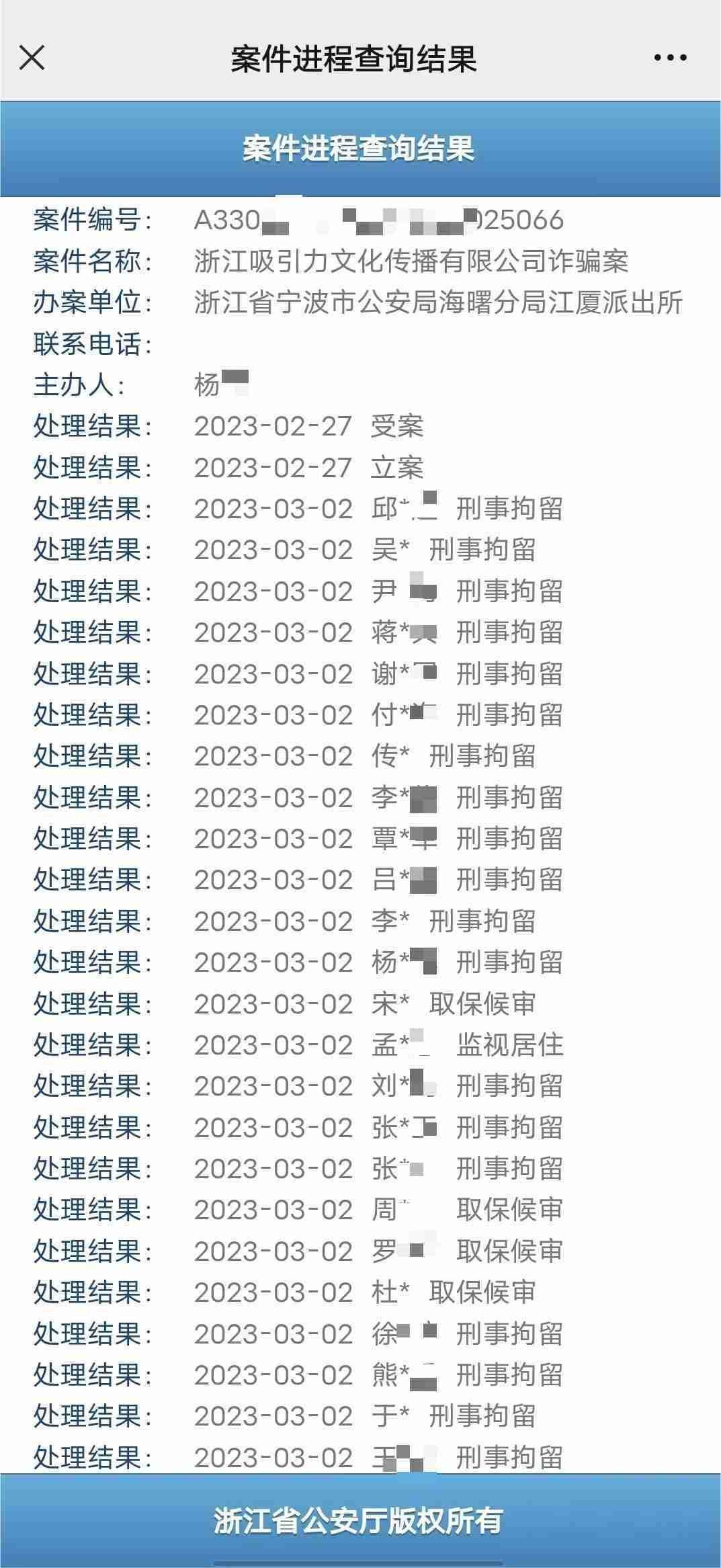 劉文軍提供的“案件進程查詢結(jié)果”顯示,3天后,張偉玉和楊濤鳴在內(nèi)的20余人被刑事拘留,還有4人被取保候?qū)彛?人被監(jiān)視居住。