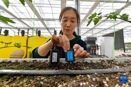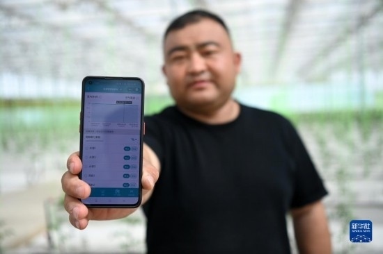 在張掖市甘州區(qū)黨寨鎮(zhèn)陳寨村玻璃智能溫室內,工作人員展示手機上的智能溫室操控系統(tǒng)(4月10日攝)。