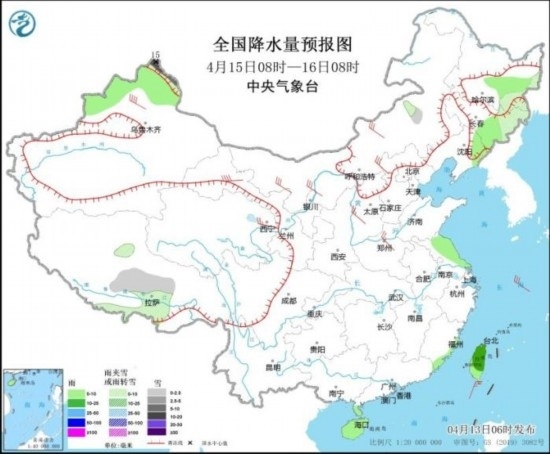4月15日08時(shí)至16日08時(shí),黑龍江東南部、吉林東部、新疆北疆北部、西藏南部等地部分地區(qū)有小到中雪或雨夾雪,其中,新疆北疆北部局地有大到暴雪(10~15毫米)。黑龍江東部、吉林東部、遼寧東部、新疆北部、江淮東部、海南島、臺(tái)灣島等地部分地區(qū)有小雨,其中,臺(tái)灣島部分地區(qū)有中雨。內(nèi)蒙古中西部、西北地區(qū)中東部、華北大部等地部分地區(qū)有4~6級(jí)風(fēng),其中,新疆沿天山地區(qū)、甘肅河西等地部分地區(qū)有6~7級(jí)風(fēng)。東海北部海域?qū)⒂?~7級(jí)、陣風(fēng)8級(jí)的西北風(fēng),臺(tái)灣以東洋面將有5~7級(jí)、陣風(fēng)8級(jí)的東北風(fēng)。