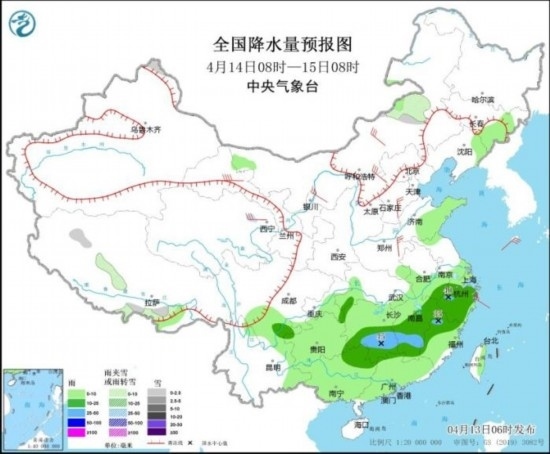 4月13日08時(shí)至14日08時(shí),內(nèi)蒙古東北部和中部、黑龍江西北部、新疆南疆盆地南部、西藏南部、青海大部、甘肅中南部和河西等地部分地區(qū)有小到中雪或雨夾雪,其中,青海東部、甘肅河西等地局地有大到暴雪(10~15毫米)。四川盆地西南部、西南地區(qū)東南部、江淮西部、江漢東部、江南北部等地部分地區(qū)有中到大雨,其中,湖南中西部和北部、江西北部等地部分地區(qū)有暴雨(50~80毫米)。內(nèi)蒙古中西部、吉林西部、遼寧大部、西北地區(qū)中東部、華北大部、山東半島等地部分地區(qū)有4~6級(jí)風(fēng),其中,西藏北部部分地區(qū)有7~8級(jí)風(fēng)。