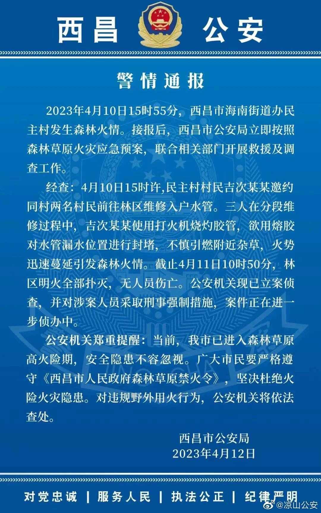 ·西昌警方通報(bào)森林火災(zāi)調(diào)查:村民燒灼膠管修水管引燃雜草,涉案人員被控制。