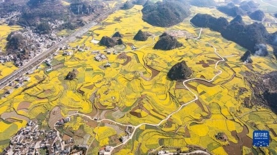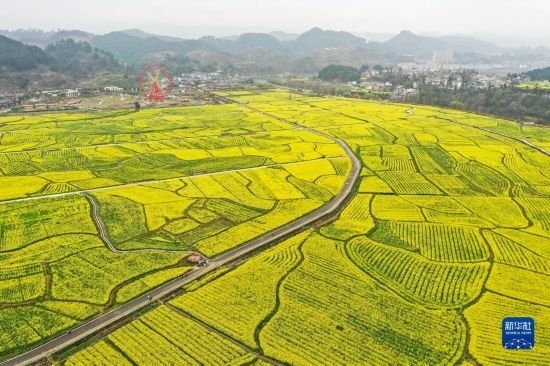 貴州省六盤(pán)水市六枝特區(qū)木崗鎮(zhèn)抵簸村的油菜花田(3月9日攝,無(wú)人機(jī)照片)。