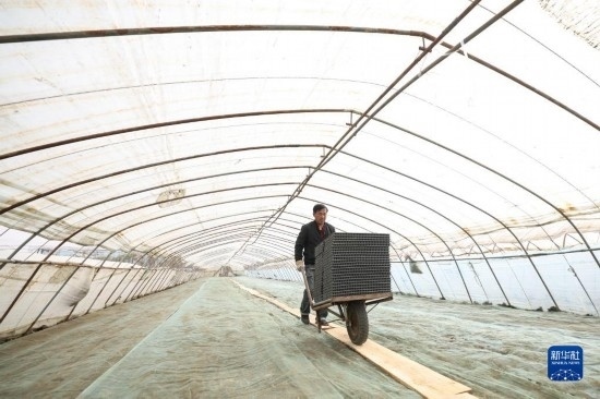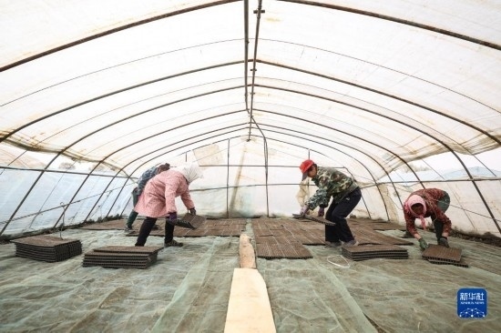 4月14日,盤錦市盤山縣的農(nóng)戶在進(jìn)行水稻秧苗育苗工作。