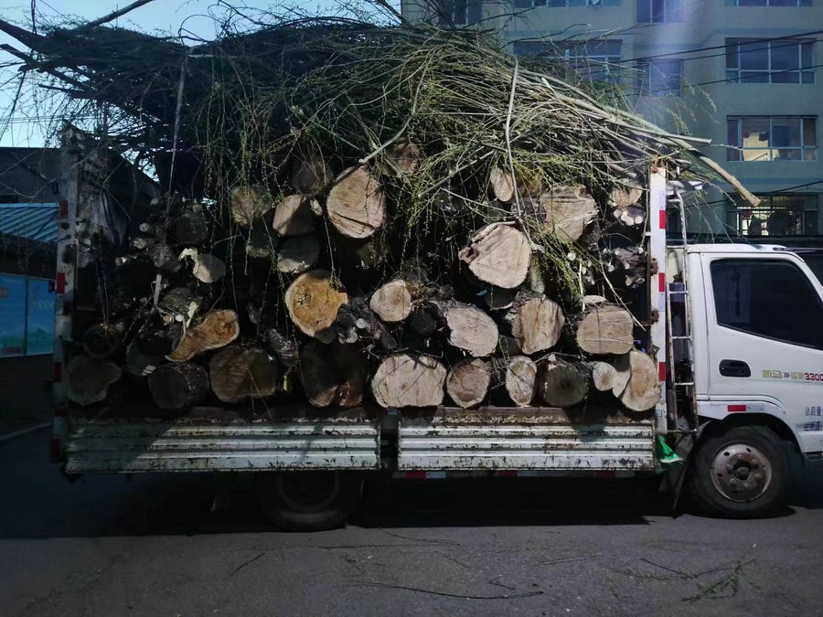 被砍伐后的樹木被裝車運走(居民供圖)